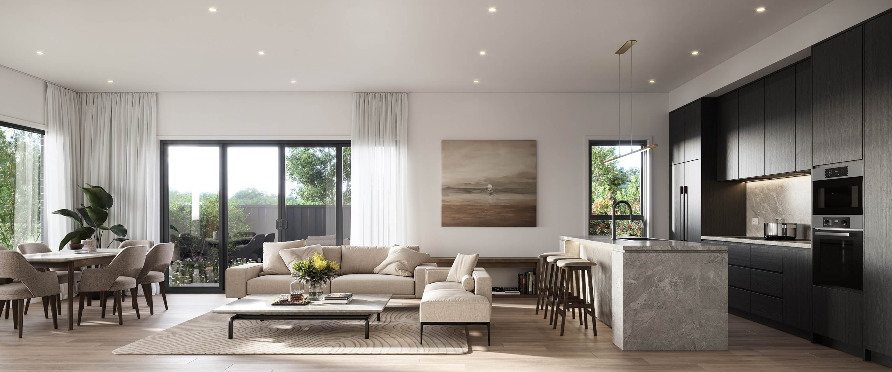 The dark interior palette brings a sense of refined elegance to each space, with deep, rich tones that create a warm, intimate atmosphere. The design creates a balanced, welcoming environment that feels both timeless and perfectly suited to contemporary living, with upgrade options available.