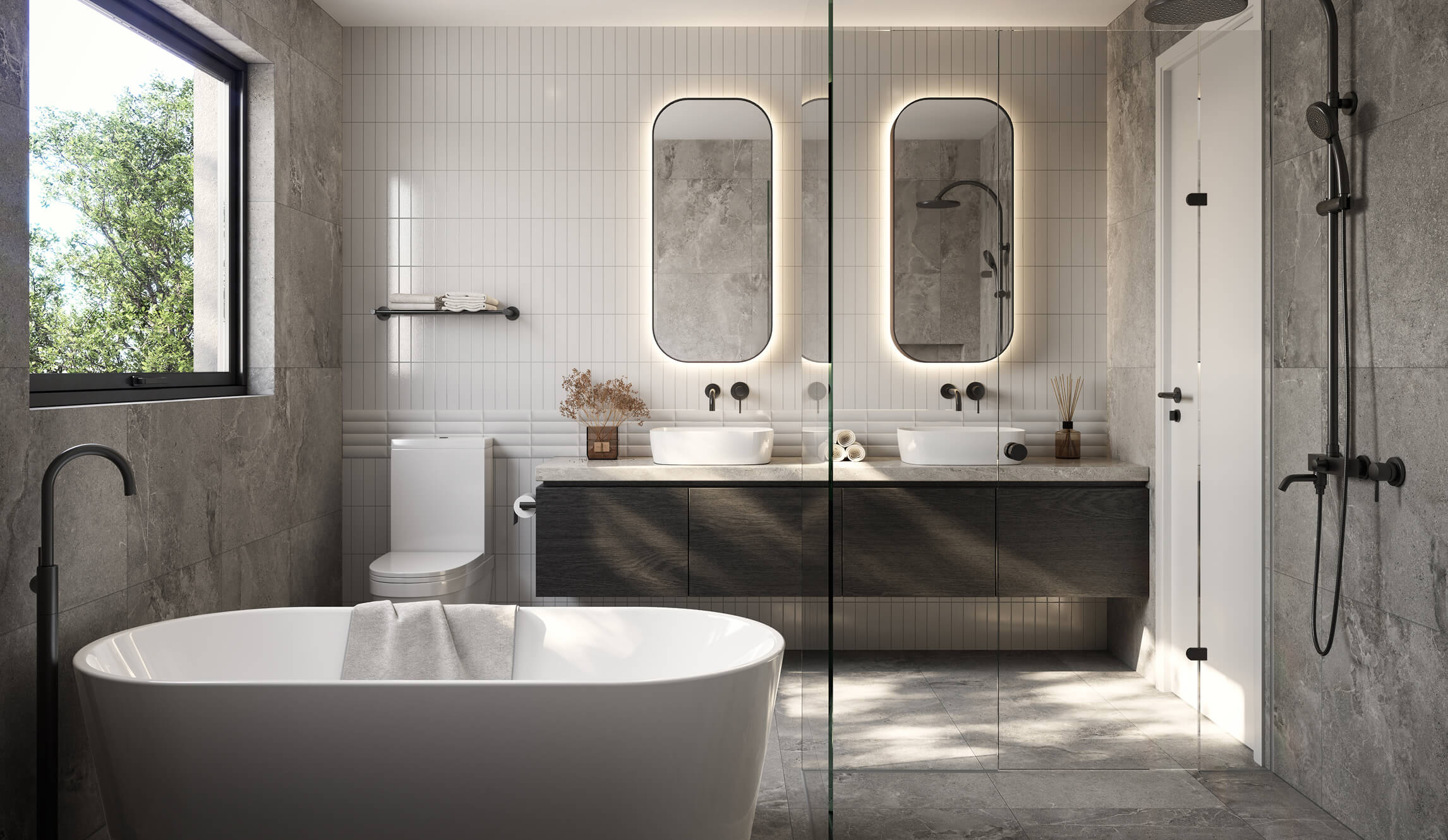 Rosemont’s dark scheme brings a bold sophistication to kitchens and bathrooms, with rich tones and sleek finishes that exude modern elegance. Kitchens feature concealed storage and Miele appliances, complemented by textured natural materials and bespoke joinery for a striking yet functional space. Bathrooms are serene retreats, blending refined dark finishes with contemporary fixtures and ample storage to create a sense of intimate luxury.